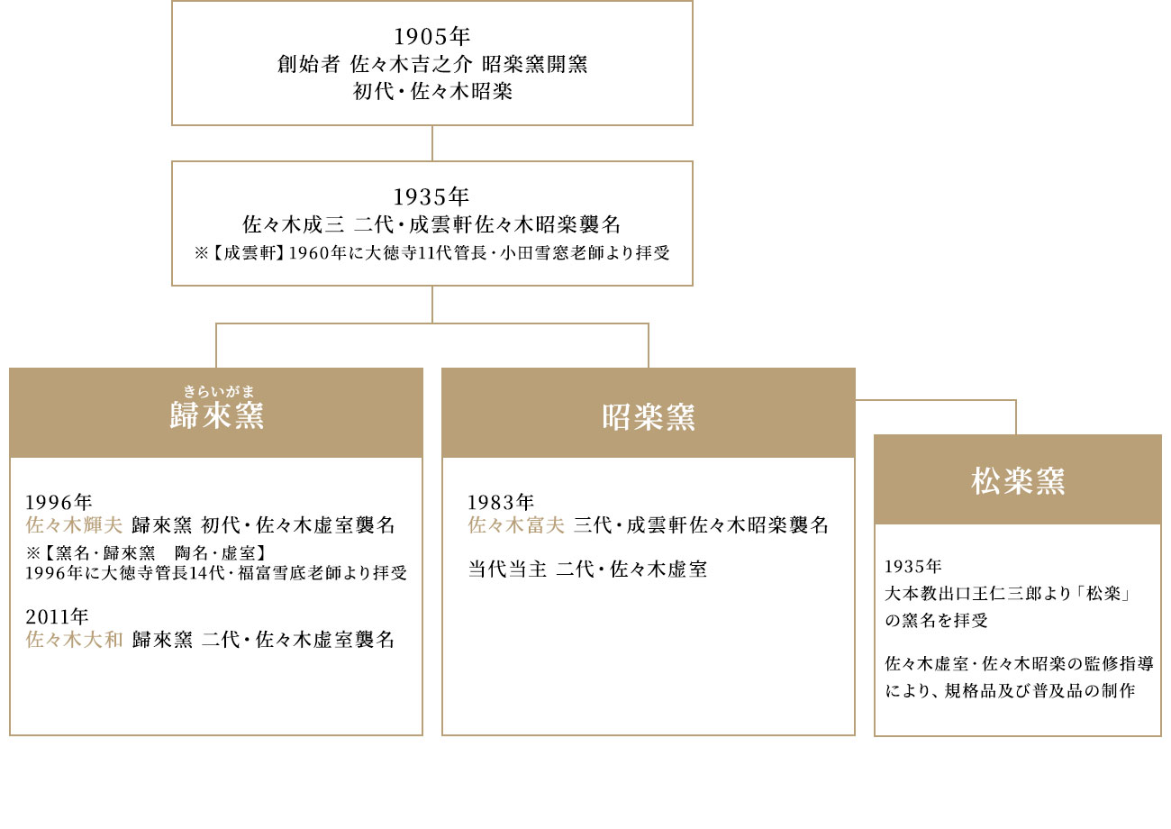 楽焼窯元の開窯から現在に至るまでの歸來窯・昭楽窯・松楽窯の歴史と佐々木家系図をご紹介します。