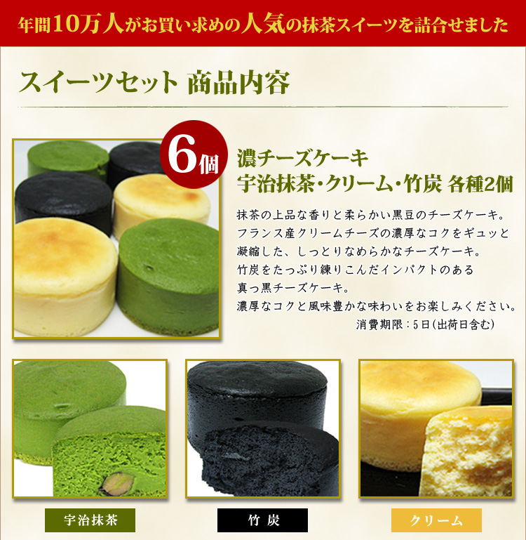 ●濃チーズケーキ 宇治抹茶チーズケーキ・クリームチーズケーキ・竹炭チーズケーキ 各種2個 消費期限:5日(出荷日含む) 保存方法:冷蔵保存