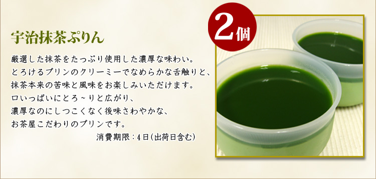 ●宇治抹茶ぷりん 2個 消費期限:4日(出荷日含む) 保存方法: 冷蔵保存