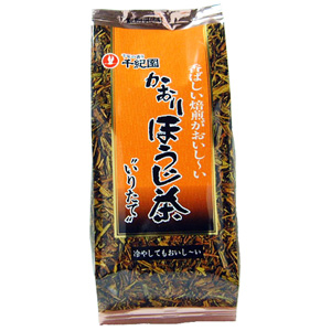 中でも千紀園のある滋賀や京都やその周辺では、番茶といえば「焙じた(煎った)番茶」のことを指します。 「ほうじ番茶」「京番茶」と呼び、古くから愛飲されています。 この「ほうじ番茶」は茶葉を揉まずに乾燥させて作るので、茶葉は茶色く大きく、独特なスモーキーな風味で、くせになる味です。