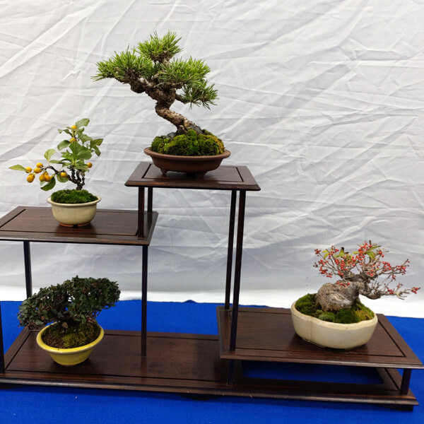 中庭に、50cm程の高さのある棚に並んだ様々な盆栽。