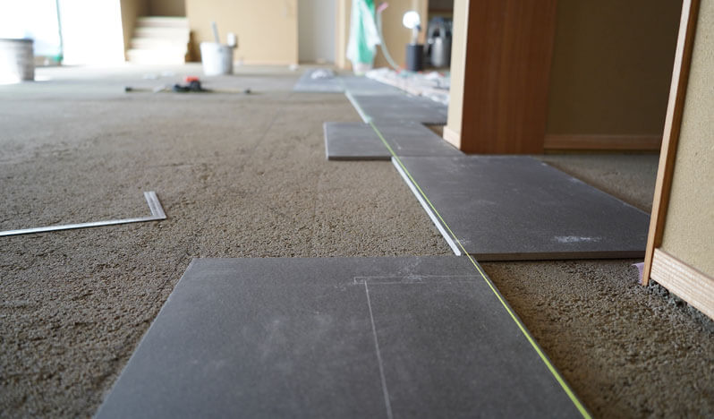 しっかり固まった土台に、職人さんたちが1枚1枚、丁寧に石タイルを張ってくださっています。