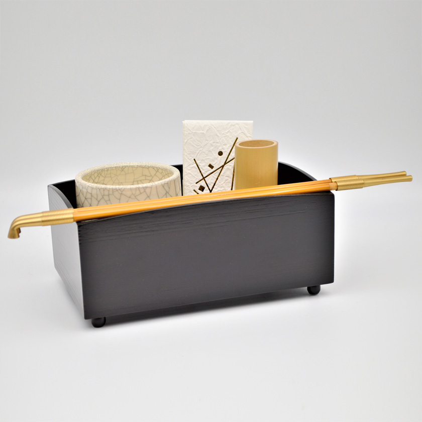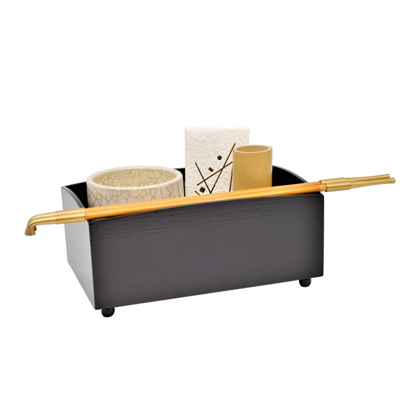 茶道具 莨盆(煙草盆・たばこぼん) 櫛型莨盆セット 一閑塗 宗之作   [貫入火入 (松楽窯)・灰吹白・煙管 如心斎好 (浄雲作)・莨タトウ (白切箔)]