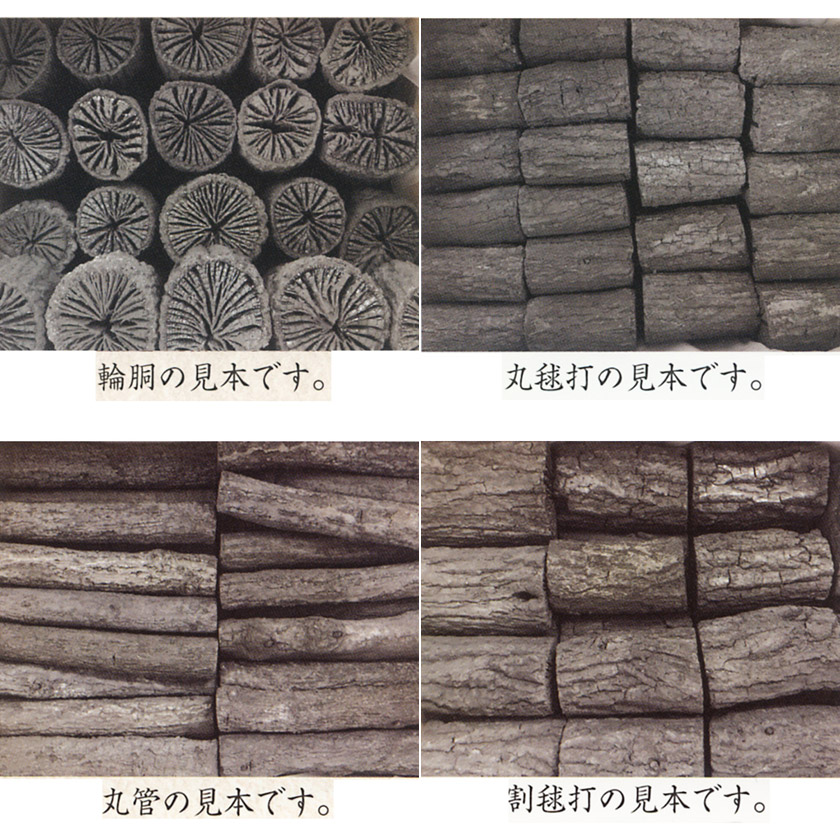 <良い茶炭の条件> 1.しまりがある。 2.樹皮が密着している。 3.炭の切り口が菊の花のように割れていて、割れ目が細かく均一である。 4.断面が真円に近い。 5.樹皮が薄い。 6.適度に精錬がきいている。